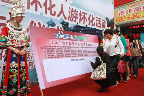 活动现场,身着盛装的侗族阿哥阿妹跳起了侗家多耶舞,唱起了侗族大歌,庆祝《旅游法》颁布,迎接中国旅游日。怀化旅游企业代表宣读了“明白消费.快乐旅游”诚信公约,怀化国大旅行社等11家旅行社负责人现场签订了《怀化旅游行业公约》,向广大市民做出了庄严承诺,依法依规经营,坚决抵制“非法经营、拒不履行合同、擅自改变行程、指定购物场所、诱骗和强迫旅游者购物或者参加自费项目”等违法行为,并现场为市民提供咨询服务。