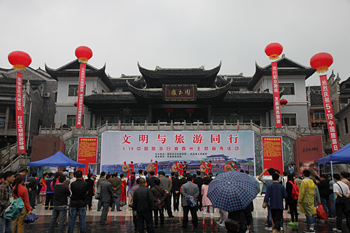 5月19日,为纪念第四个“中国旅游日”,弘扬文明旅游理念,增强文明旅游意识,由湘西州旅游局、凤凰县人民政府主办,凤凰县旅游局承办的 “5.19”中国旅游日大型宣传活动——“文明与旅游同行”在凤凰县丛文广场举行。上午的凤凰古城虽然大雨滂沱,活动仍然如期举行,开幕式在游客和群众热情的期盼中,伴随着吉首德夯旅游公司表演队精彩的鼓舞声拉开帷幕。