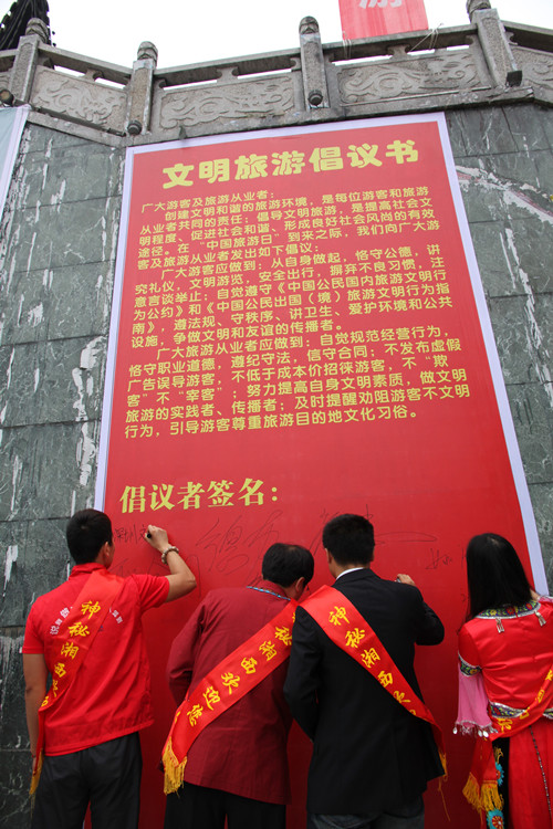 州旅游局局长欧道胜、凤凰县副县长龙庭作出席活动并致辞。仪式上,旅游企业、导游代表向游客发起文明旅游倡议,宣读《文明旅游倡议书》并当场签名。参加活动的有州旅游局全体干部、各县市旅游局及州内部分旅游企业负责人。活动咨询服务区,州旅游局、各县市旅游局、旅游企业开展旅游安全应急管理、防灾减灾、旅游保险、《旅游法》知识及景区、旅游产品等宣传推介,现场为游客进行旅游咨询服务,向游客发放《旅游法》单行本、《中国公民国内旅游文明行为公约》、《中国公民出国(境)旅游文明行为指南》、《需要重点整治的十种旅游不文明行为》等宣传资料。活动现场,来宾、游客、市民欣赏表演并涌跃参加有奖知识竟猜,气氛热烈。