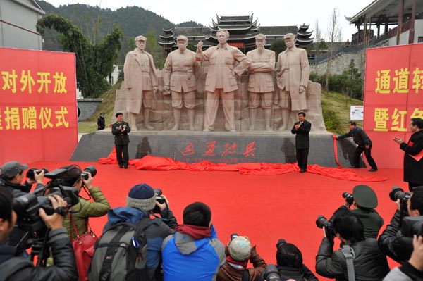 12月12日上午,在通道县县溪镇通道转兵纪念馆广场,举行了通道转兵纪念馆对外开放暨红色旅游书屋捐赠仪式。何报翔副省长、何骏副政委共同为中央红军通道转兵雕像揭幕。雕像长9.1米,宽3.3米,高1.2米,生动再现了“通道转兵”的历史情节,由中国人民解放军某部队捐赠。会上还举行了红色旅游书屋捐赠仪式,全国红办向通道县赠送牌匾。“红色旅游书屋”将为游客提供一个全面了解革命历史、增强民族自豪感和弘扬爱国主义平台。随后,与会领导、嘉宾和群众一起参观了重新修建的通道转兵纪念馆。