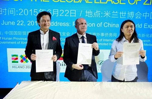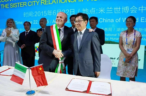 “水土之恋情定米兰”,在紫鹊界米兰世博推介会上,中华人民共和国湖南省娄底市新化县与意大利普利亚大区波利尼亚诺阿马雷市举行了建立友好城市关系备忘录暨友好城市关系备忘录签字仪式。在中意两国播下一颗友谊的种子,为两座城市开展友好合作奠定了坚实的基础,也为两地的经济社会发展描绘了美好的愿景。