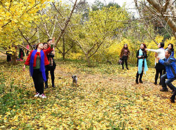邵阳县袁家山10亩金黄银杏林 吸引游客合影