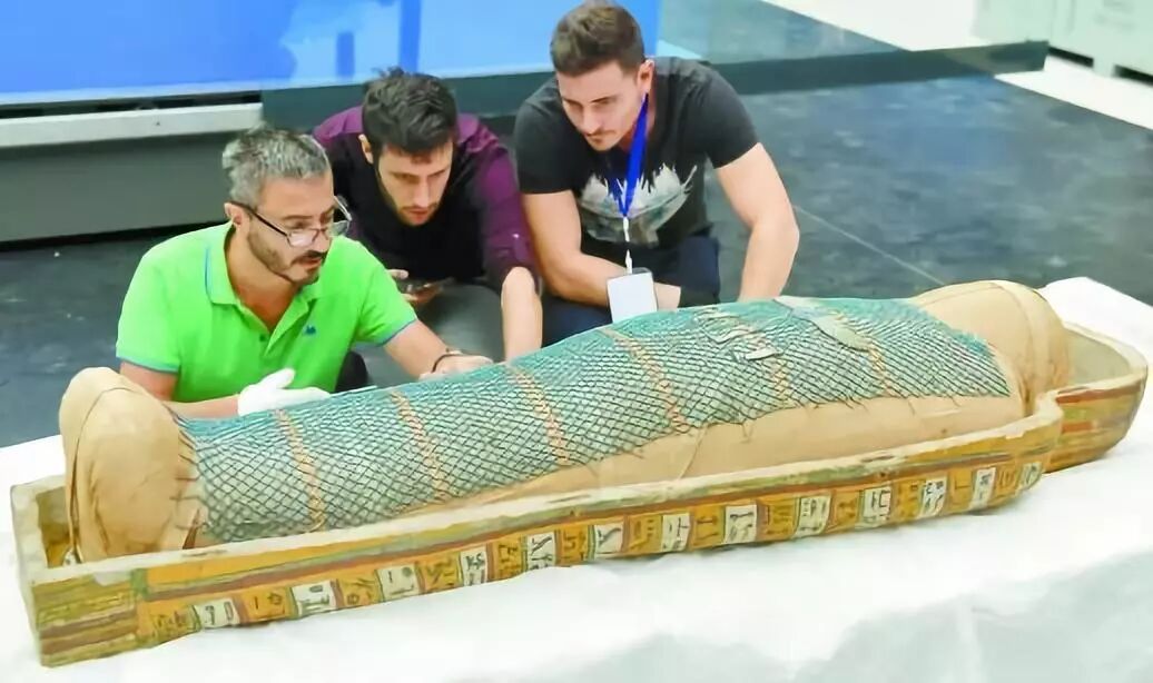 工作人员在对木乃伊进行开箱布展