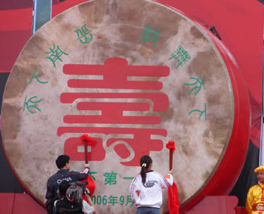 今天上午,奥运冠军熊倪、龚智超手持鼓槌撞击直径近4米的“天下第一鼓大鼓”,拉开了2006年湖南旅游节、南岳寿文化开幕式。