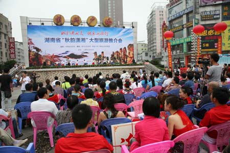 9月19日,由省旅游局主办,湖南人民广播电台和各市州旅游局承办,天心区人民政府特别协办的“秋韵潇湘”大型旅游推介活动在长沙市黄兴路步行街中心广场隆重举行。省旅游局党组书记、局长杨光荣出席,省旅游局党组成员、副局长熊健致辞并宣布活动启动,湖南人民广播电台台长罗毅致辞,省旅游局机关各处室、各地州市旅游局负责人参加此次活动。湖南日报、湖南卫视、中国旅游报、红网、潇湘晨报、三湘都市报等17家主流媒体记者现场参加报道了此次推介活动。