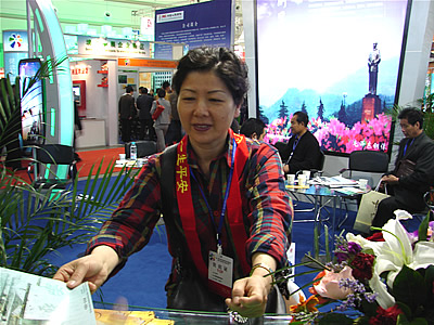 湖南旅游展台工作人员正热情地发放精美招商手册