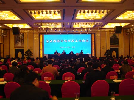 会议由湖南省旅游局局长杨光荣主持。首先由刘之明副局长作了题为“逆势而上,开拓市场 促进我省旅游产业稳定较快增长”的主题报告。刘之明副局长指出这次市场开发工作会议是按照省委省政府关于“保增长、扩内需、调结构、促就业、强基础”的总体部署要求,贯彻全国旅游工作会议和全国旅游市场工作会议精神,围绕加快实现由旅游资源大省向旅游产业大省转变的目标,分析全省旅游市场面临的新形势,对2008年全省旅游市场开发工作进行回顾总结,部署2009年全省旅游市场开发工作任务。刘之明副局长首先传达了全国旅游市场工作会议的主要精神,回顾了08年全国旅游市场运行情况和工作情况,分析了我国旅游产业发展面临的形势。对我省2008年全省旅游市场开发工作作了简要回顾,在面临诸多不利因素的影响下,较好地完成了全年的工作任务,全省旅游产业发展的质量和效益不断提高,旅游市场呈现出总体平稳增长的良好势头。在会上还部署了2009年全省旅游市场开发工作的主要任务。确定今年市场开发工作的重点是,一手抓项目建设,一手抓市场促销;指导思想是以科学发展观为指导,按照培育壮大旅游支柱产业的要求,围绕全省旅游产业发展目标,结合“中国生态旅游年”主题,客服困难抓住机遇,逆势而上促发展,大力开拓市场,着力提高效益,树立更为鲜明的湖南旅游整体形象,实现我省旅游市场的全面协调可持续发展。