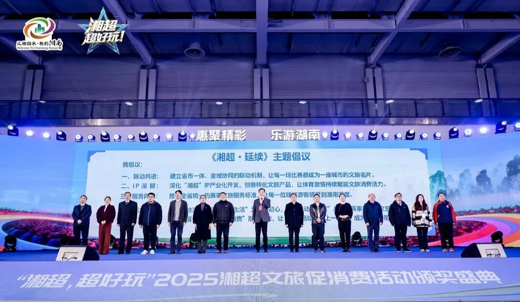 活动发布了《湘超·延续》主题倡议。湖南将以“湘超”为重要抓手,完善“观赛+旅游”服务标准体系,持续开发具有湖湘文化标识的主题文旅产品体系,拓展多元消费场景,推动体育赛事与文旅产业向体系化、标准化、常态化深度融合。