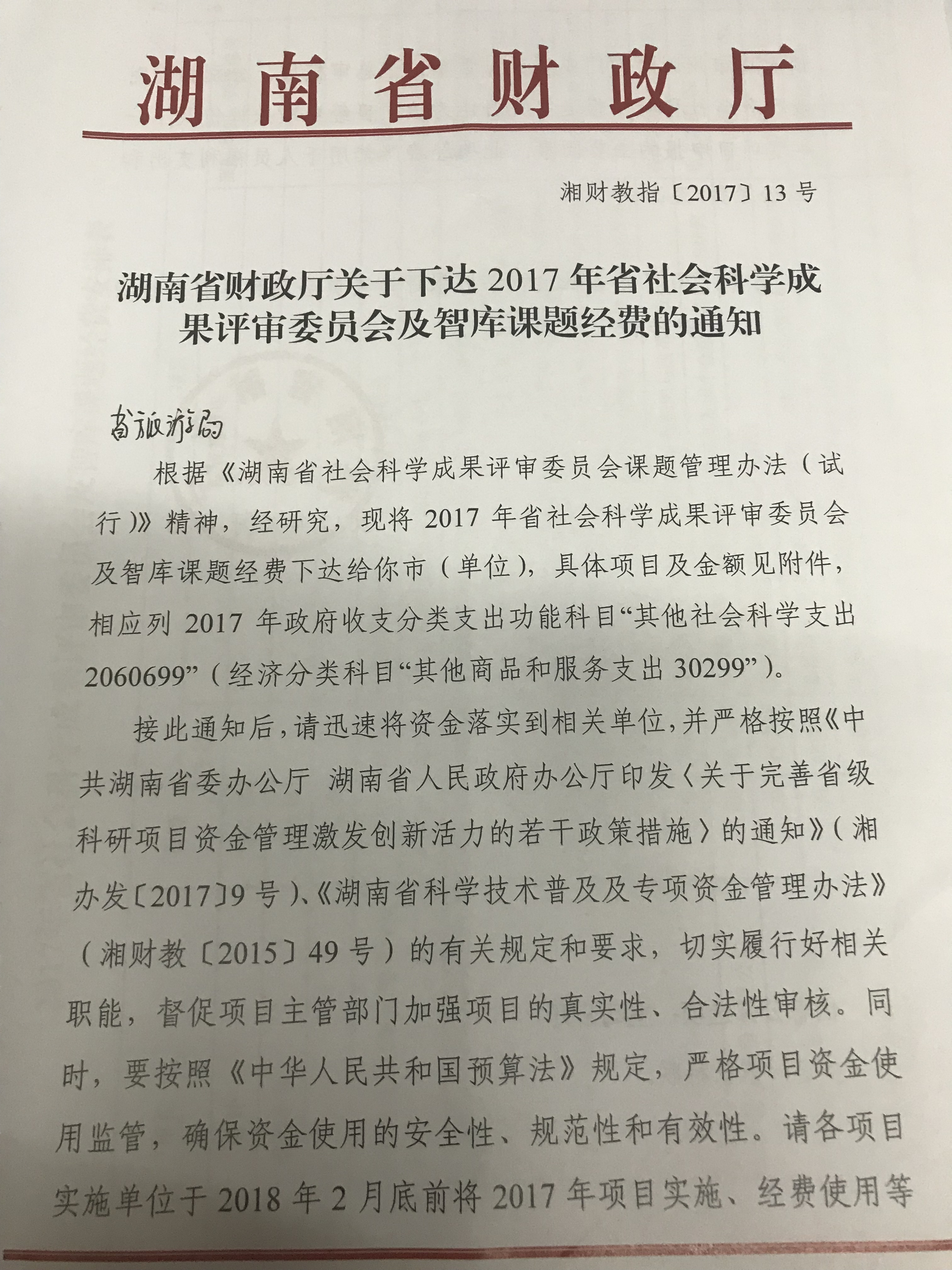 湖南省财政厅关于下达2017年省社会科学成果评审委员会及智库课题经费的通知