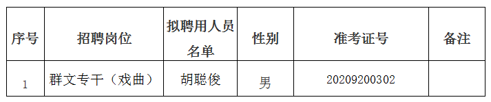 根据《湖南省文化和旅游厅所属事业单位2020年公开招聘公告》及有关规定,经公开报名、资格审查、笔试、面试、体检、考察等程序,经公开招聘领导小组集体研究决定,确定胡聪俊同志为湖南省文化馆2020年第二批公开招聘拟聘用人选,现予以公示。