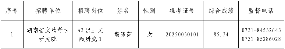 根据《湖南省文物考古研究院2025年公开招聘公告》有关要求,经报名、资格审查、直接考核、体检、考察等程序,确定黄宗茹同志为湖南省文物考古研究院2025年公开招聘A类岗位(第一批)拟聘用人员,现予以公示。