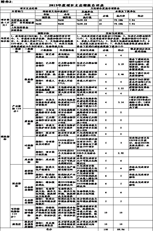 根据《湖南省财政厅关于开展2019年度部门整体支出绩效自评工作的通知》(湘财绩〔2020〕4号)的附件《2019年度项目支出绩效自评表》,从产出、效益、可持续发展和满意度四大项指标进行综合评分为89.96分,财政支出绩效等级为“良好”。