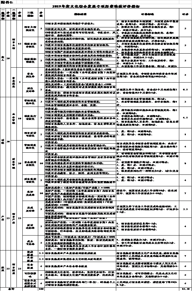 根据《2019年度文化综合发展专项经费绩效评价指标》,从投入、过程、产出和绩效4大项指标进行评价打分,各个项目支出基本合理、规范、有效,取得了良好的社会效益和可辐射的经济效益。该项资金绩效评价综合得分为85.50分,财政支出绩效等级为“良好”。