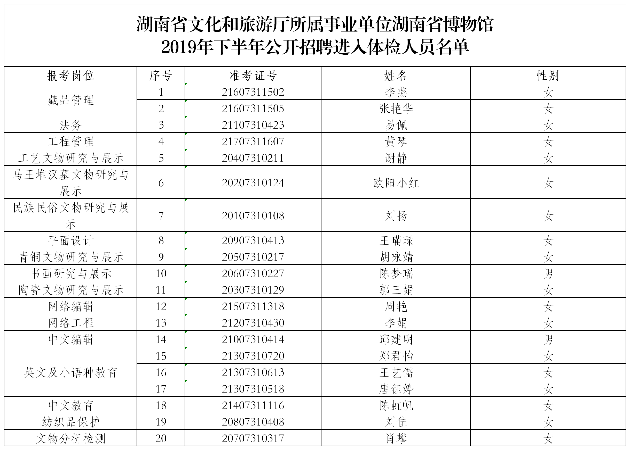 湖南省文化和旅游厅所属事业单位湖南省博物馆2019年下半年公开招聘进入体检人员名单