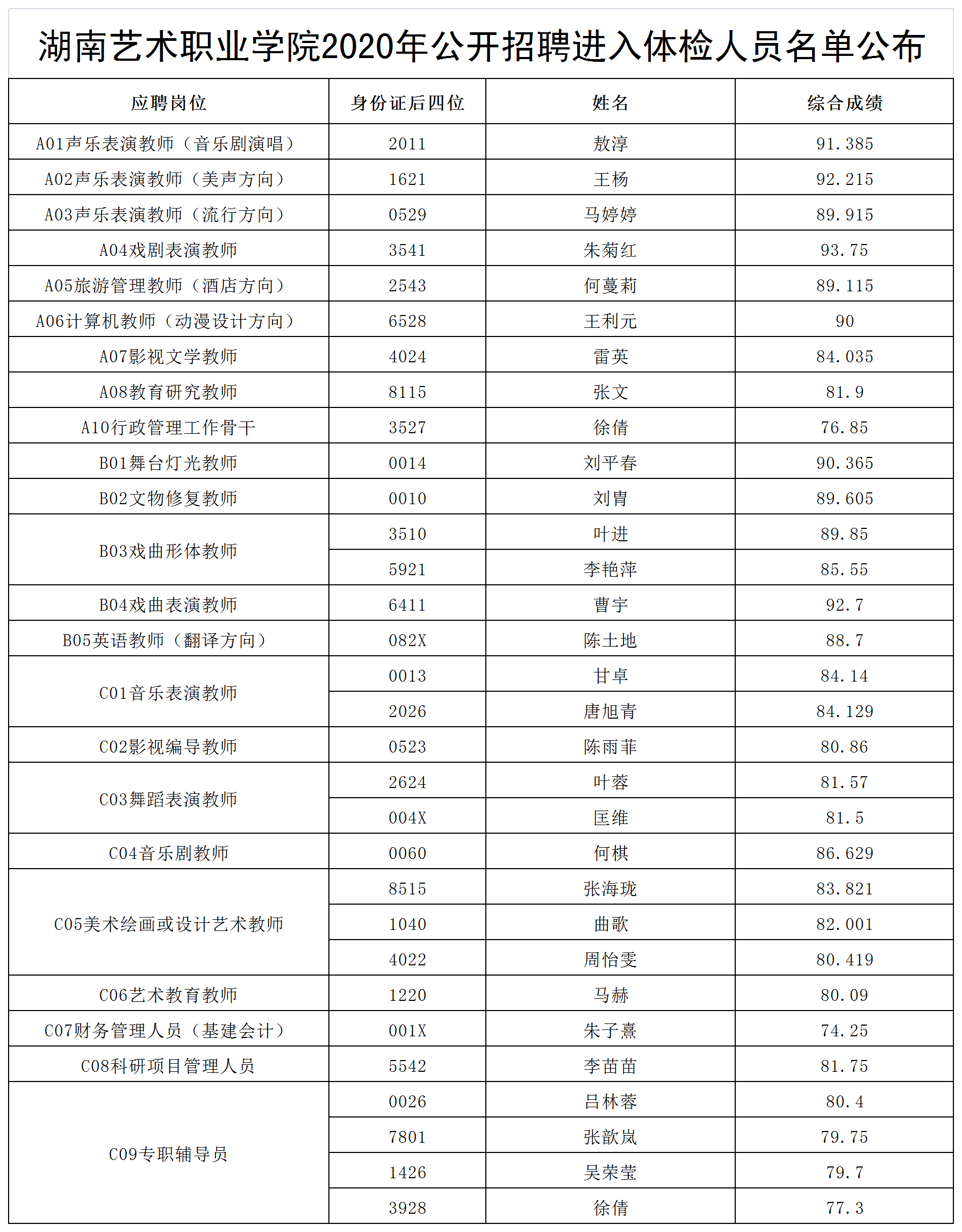 湖南艺术职业学院2020年公开招聘进入体检人员名单公布