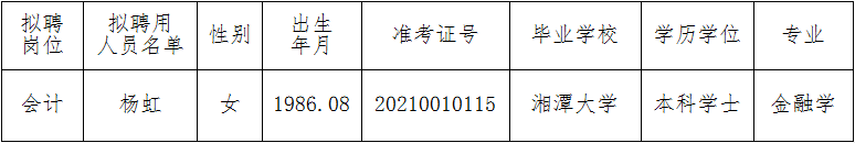 根据《湖南省文化和旅游厅艺术幼儿园2021年公开招聘公告》要求及有关规定,经公开报名、资格审查、笔试、面试、体检与考察等程序,经湖南省文化和旅游厅艺术幼儿园公开招聘工作领导小组集体研究决定,确定杨虹同志为2021年湖南省文化和旅游厅艺术幼儿园公开招聘拟聘用人选,现予以公示。