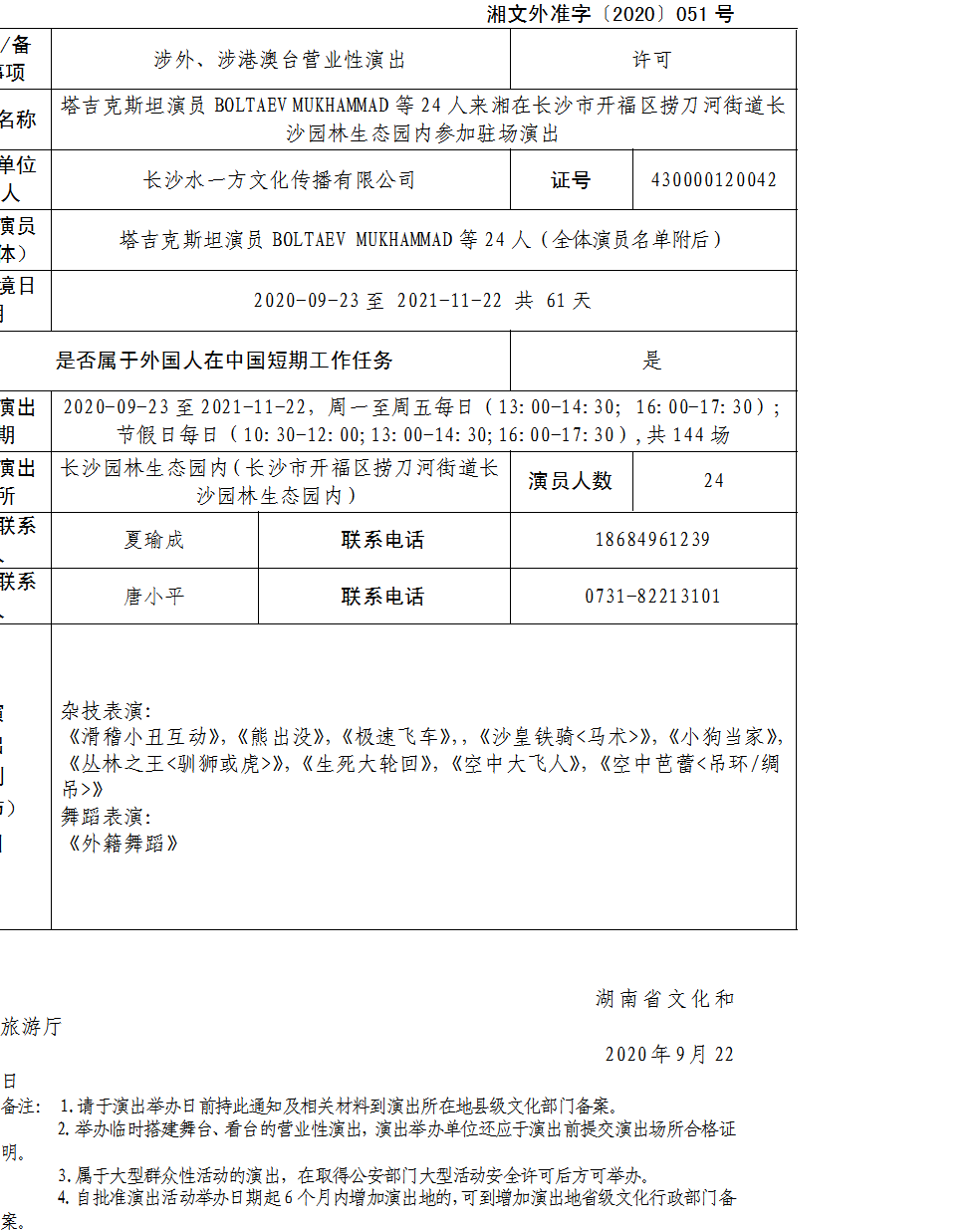 湖南省营业性演出准予许可决定-湘文外准字〔2020〕051号