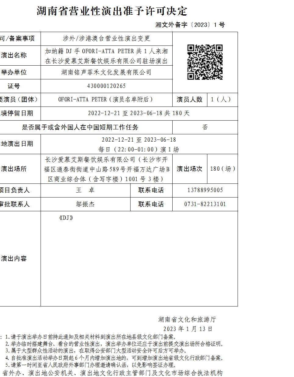 湖南省营业性演出准予许可决定-湘文外备字〔2023〕1号