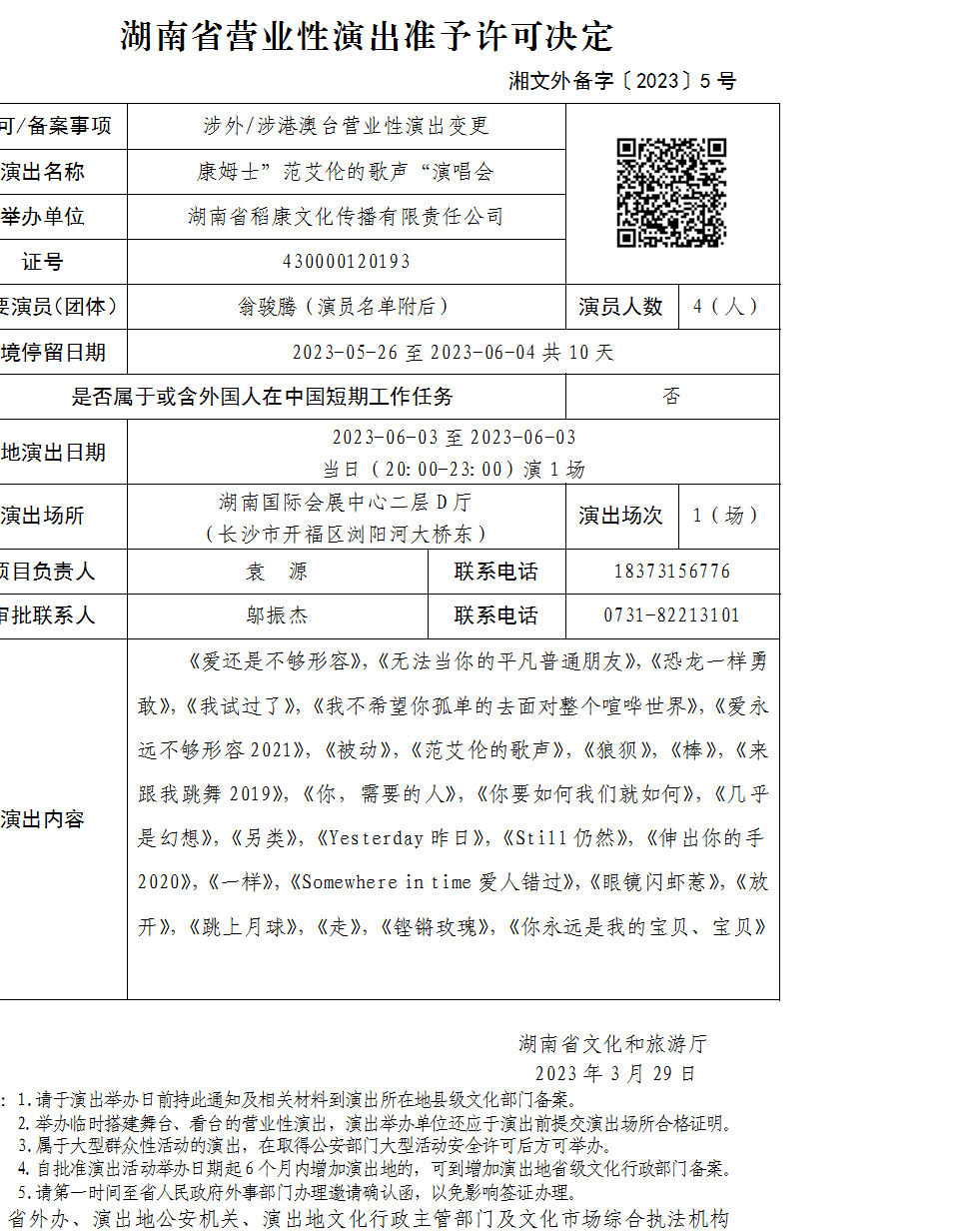 湖南省营业性演出准予许可决定-湘文外备字〔2023〕5号