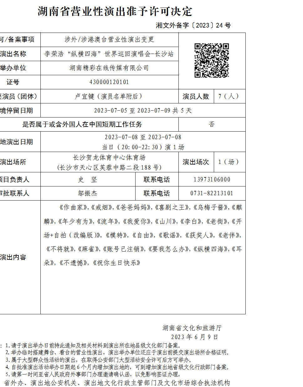 湖南省营业性演出准予许可决定-湘文外备字〔2023〕24号