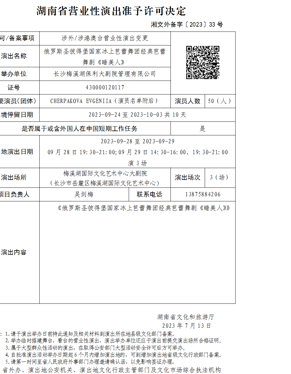 湖南省营业性演出准予许可决定-湘文外备字〔2023〕33号