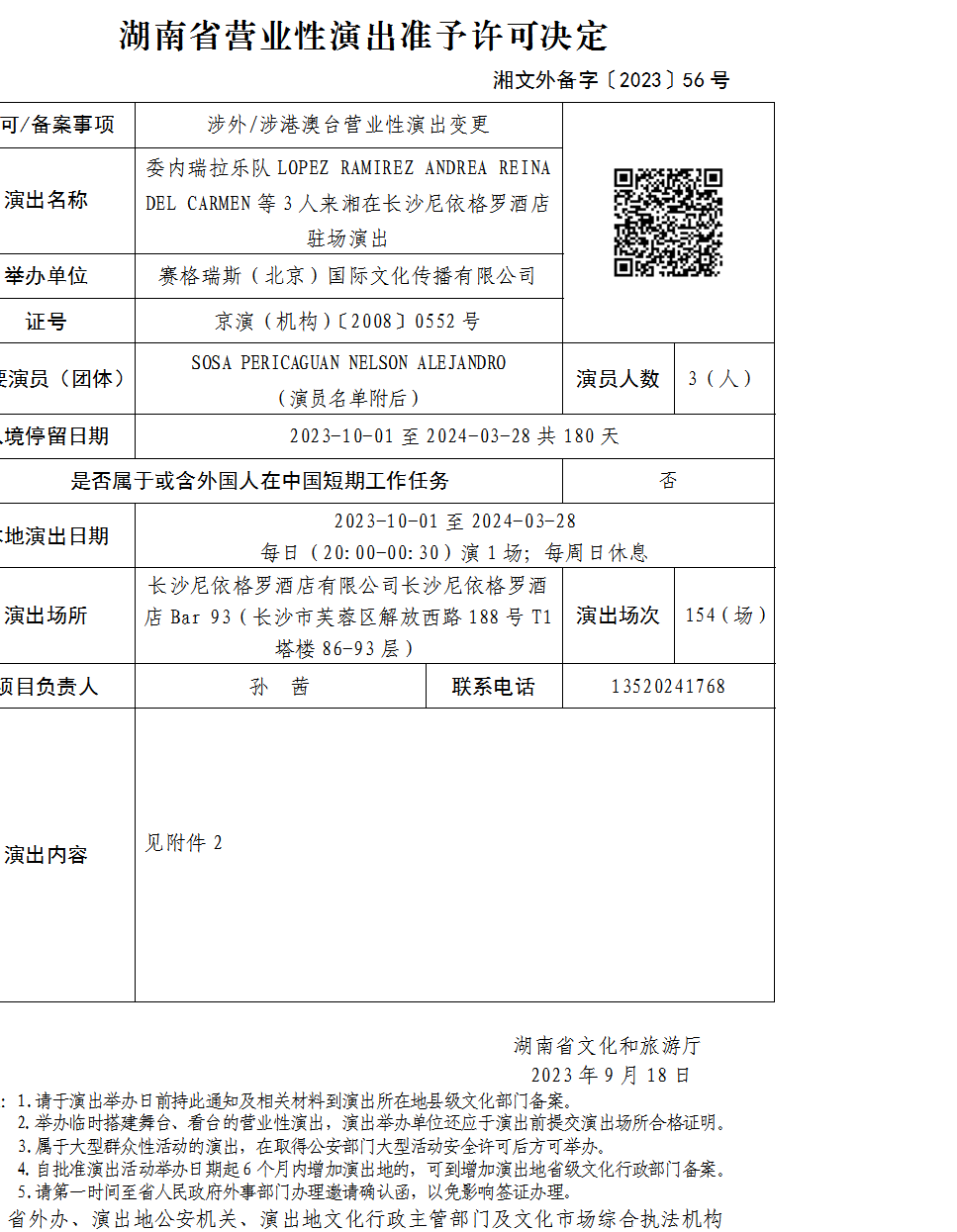 湖南省营业性演出准予许可决定-湘文外备字〔2023〕56号