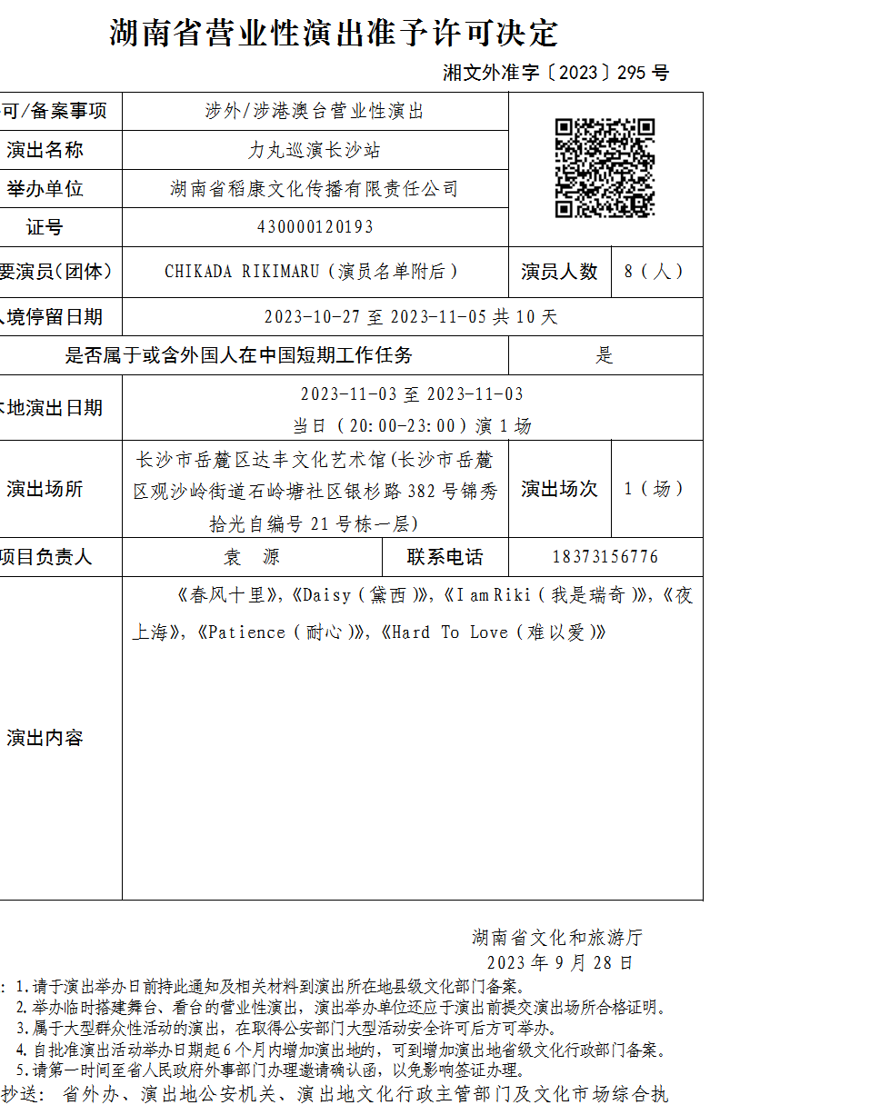湖南省营业性演出准予许可决定-湘文外准字〔2023〕295号