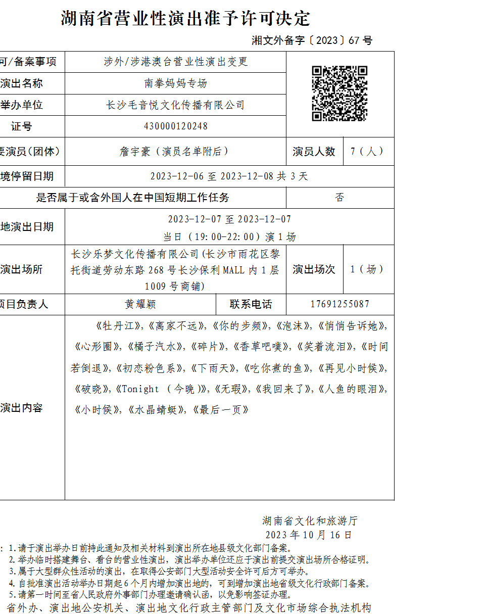 湖南省营业性演出准予许可决定-湘文外备字〔2023〕67号