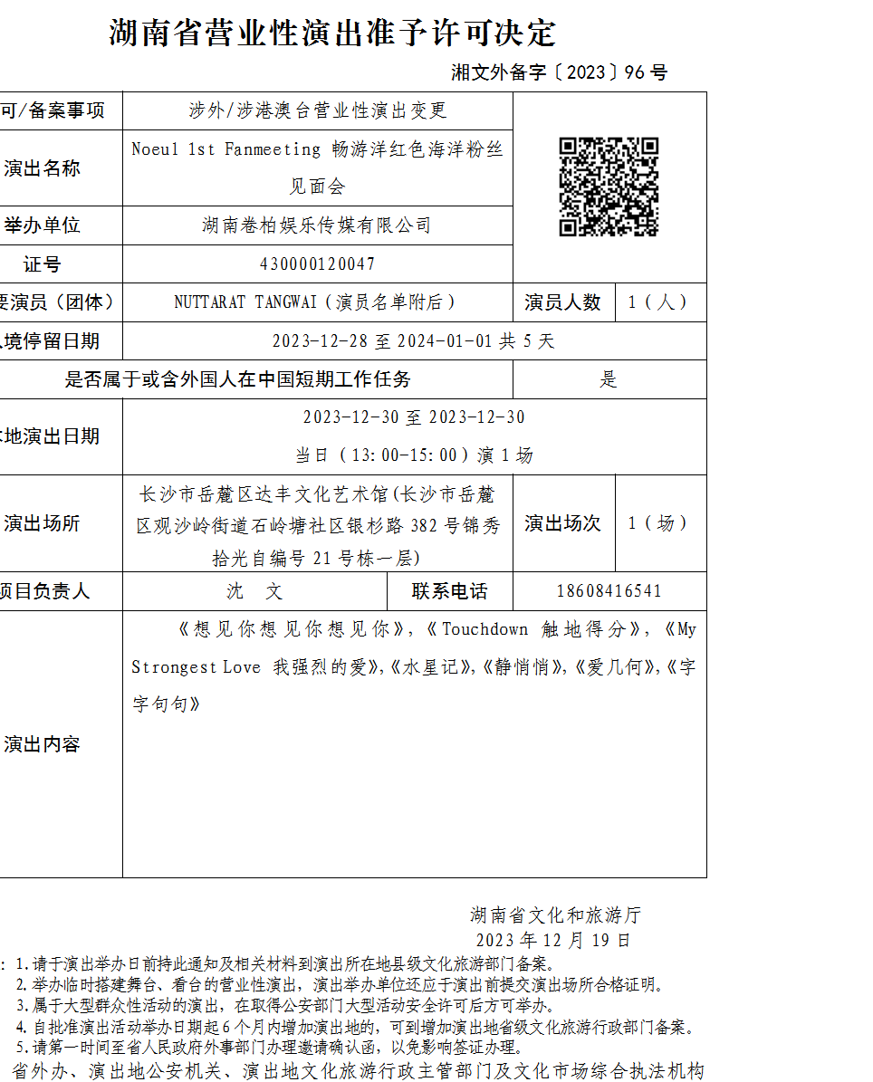 湖南省营业性演出准予许可决定-湘文外备字〔2023〕96号