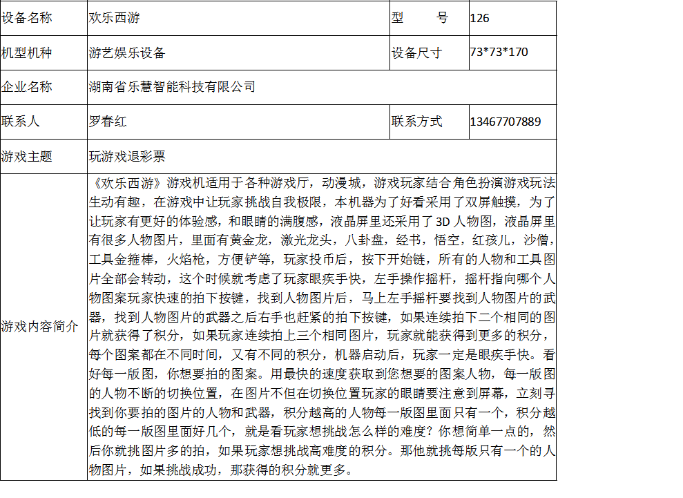 游戏游艺设备内容公示信息