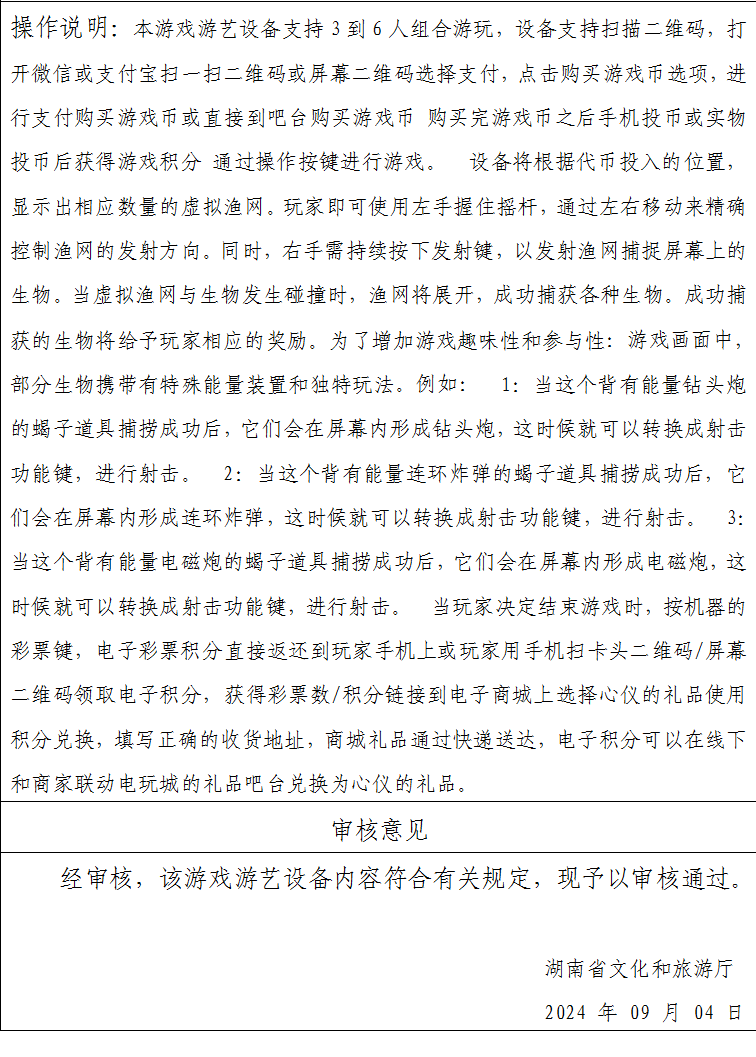 游戏游艺设备内容核准单-批准文号:湘游艺审〔2024〕114号