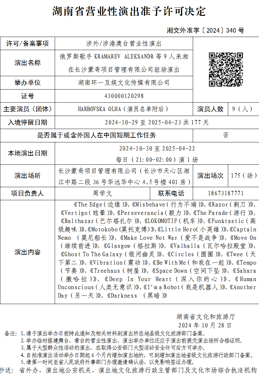 湖南省营业性演出准予许可决定-湘文外准字〔2024〕340号
