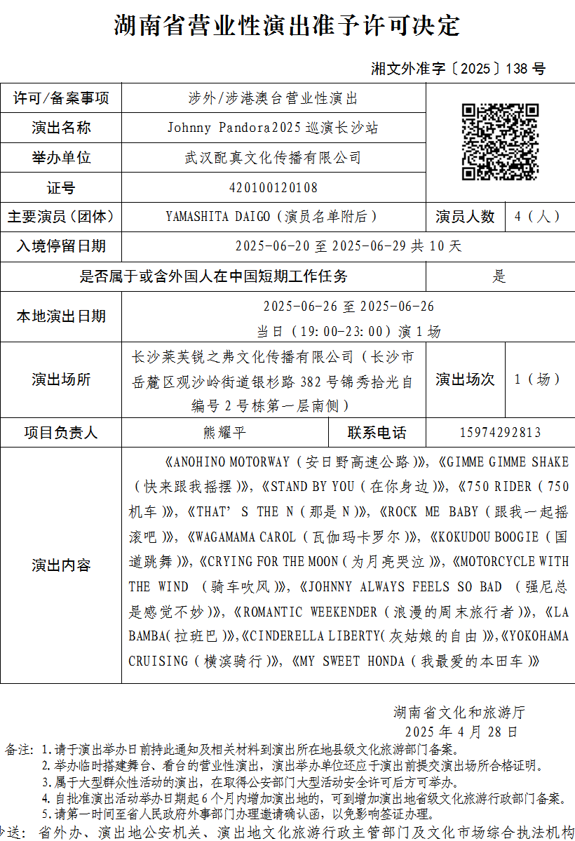 湖南省营业性演出准予许可决定-湘文外准字〔2025〕138号