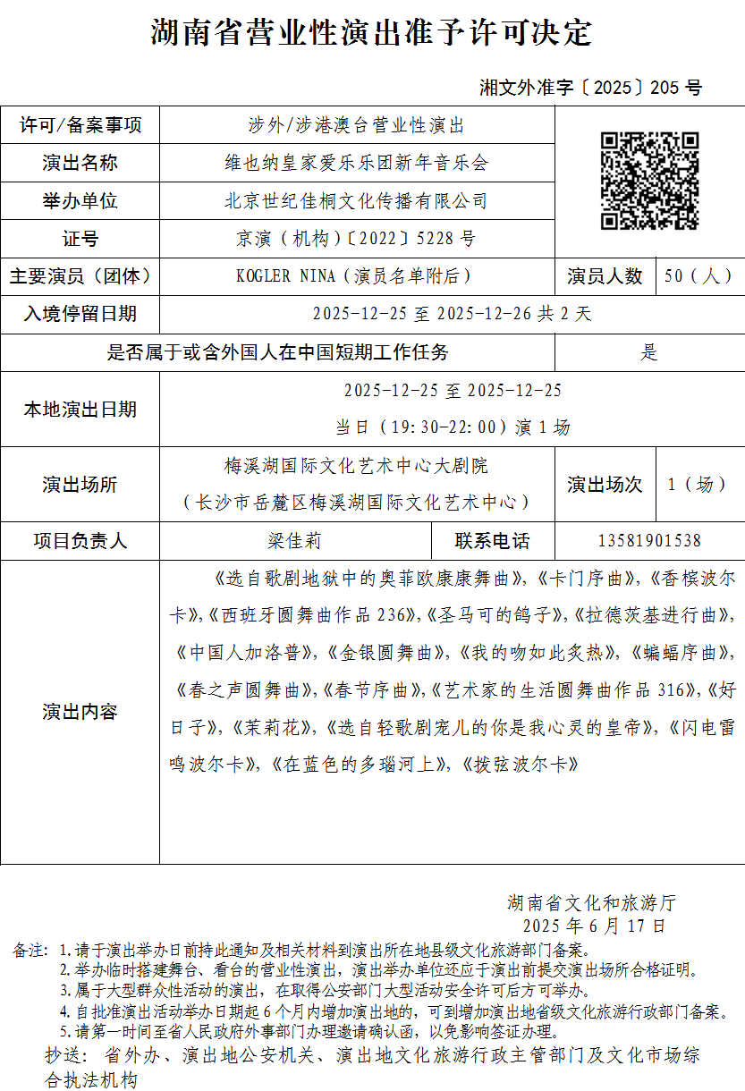 湖南省营业性演出准予许可决定-湘文外准字〔2025〕205号