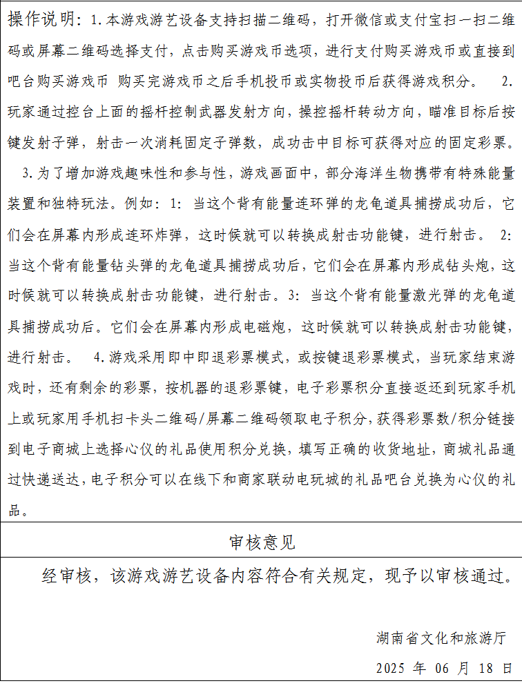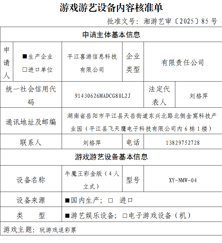 游戏游艺设备内容核准单-批准文号:湘游艺审〔2025〕85号