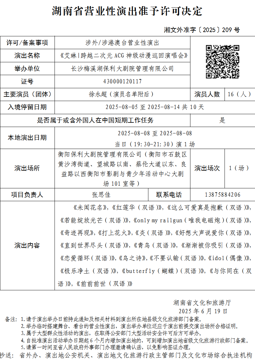 湖南省营业性演出准予许可决定-湘文外准字〔2025〕209号