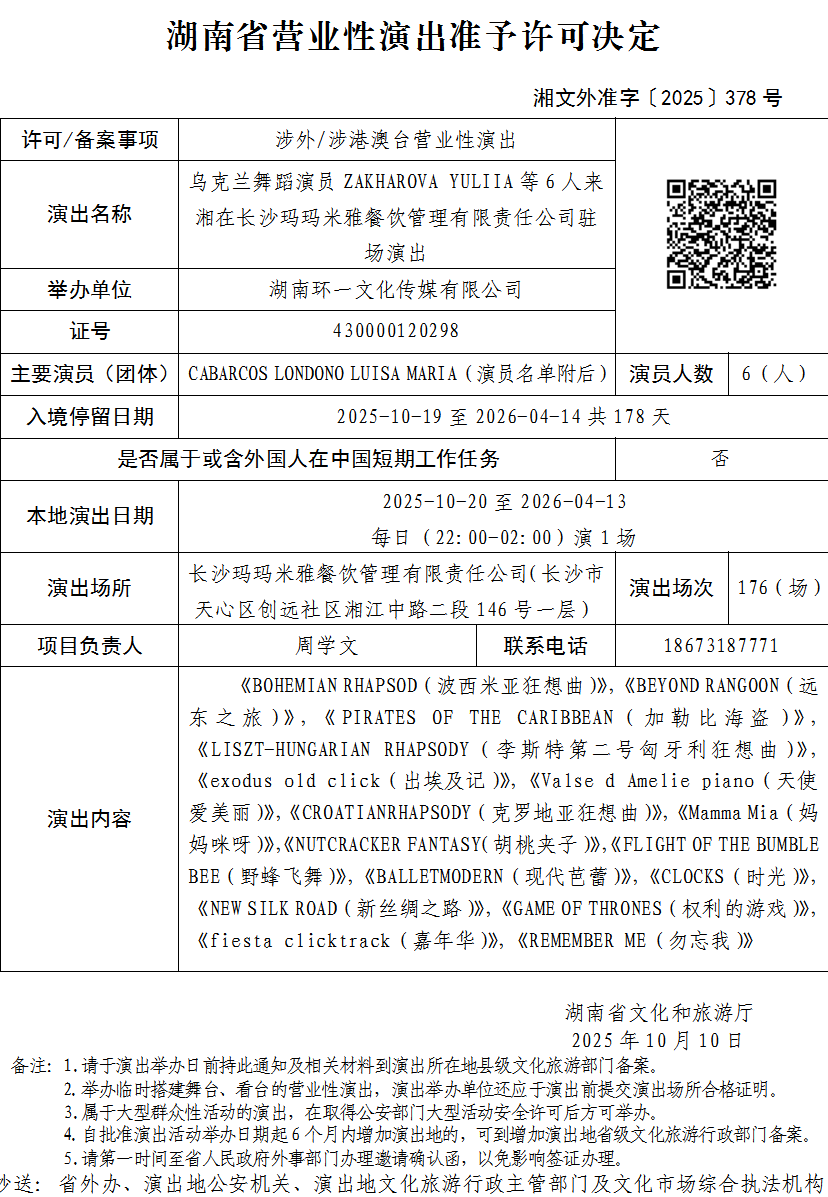 湖南省营业性演出准予许可决定-湘文外准字〔2025〕378号