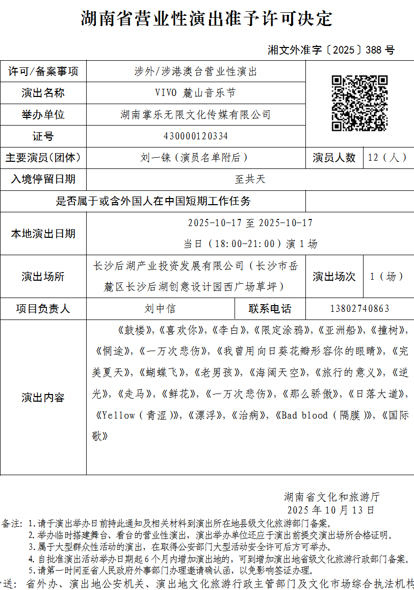 湖南省营业性演出准予许可决定-湘文外准字〔2025〕388号