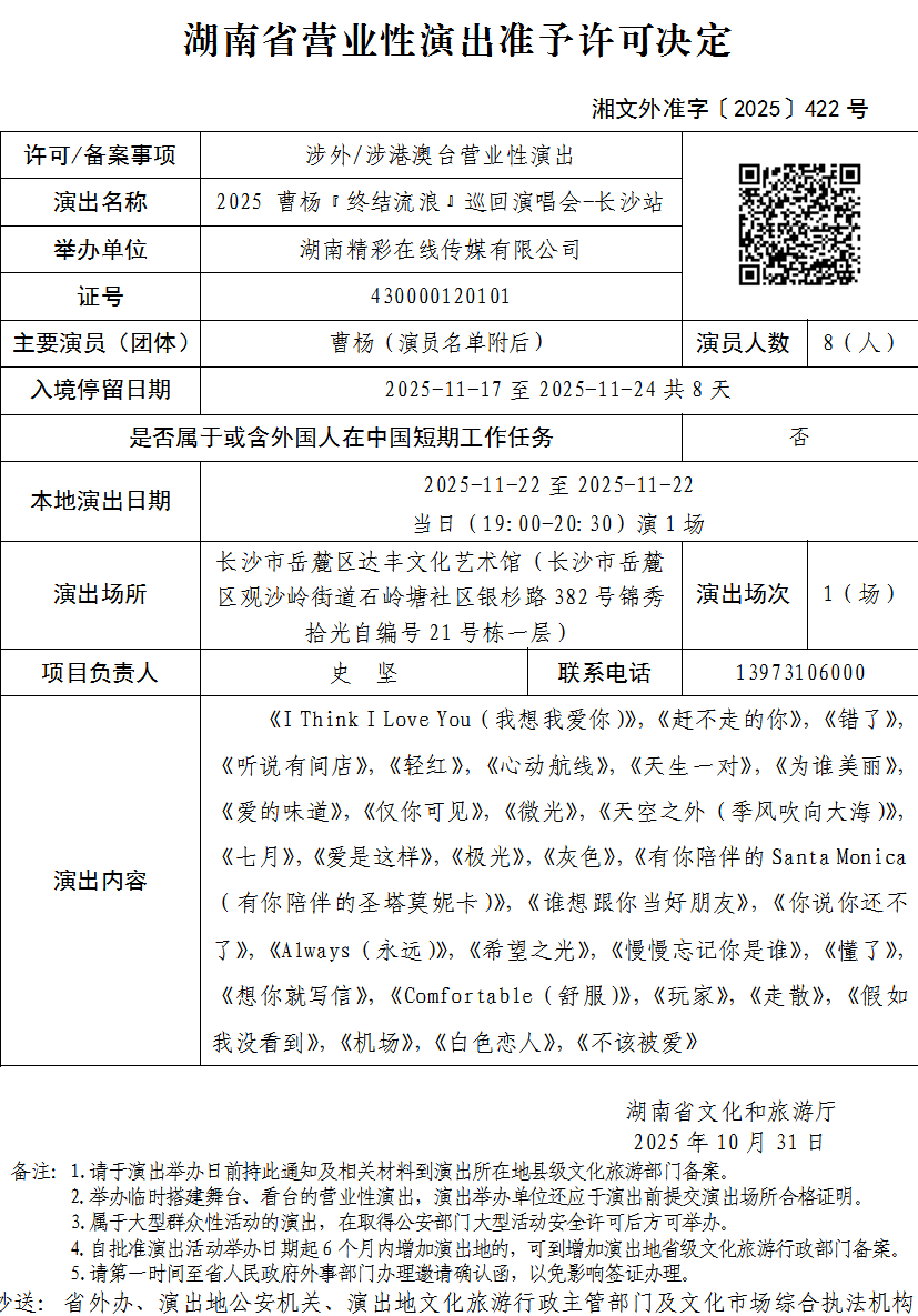 湖南省营业性演出准予许可决定-湘文外准字〔2025〕422号