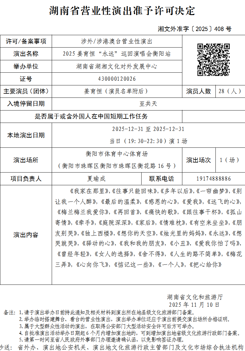 湖南省营业性演出准予许可决定-湘文外准字〔2025〕408号