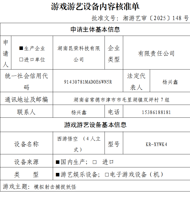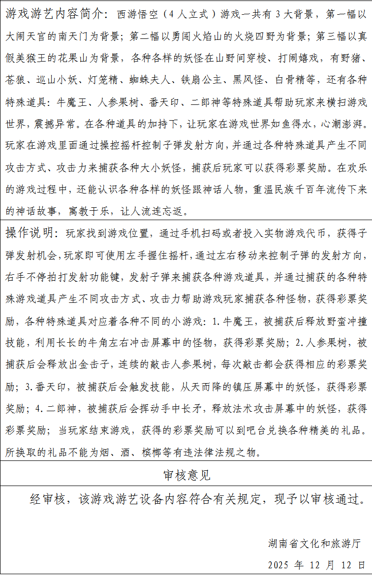 游戏游艺设备内容核准单-批准文号:湘游艺审〔2025〕148号