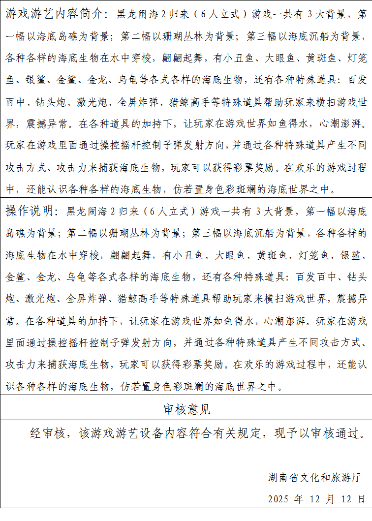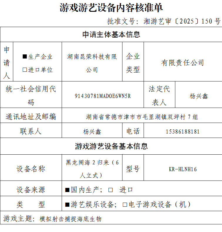 游戏游艺设备内容核准单-批准文号:湘游艺审〔2025〕150号