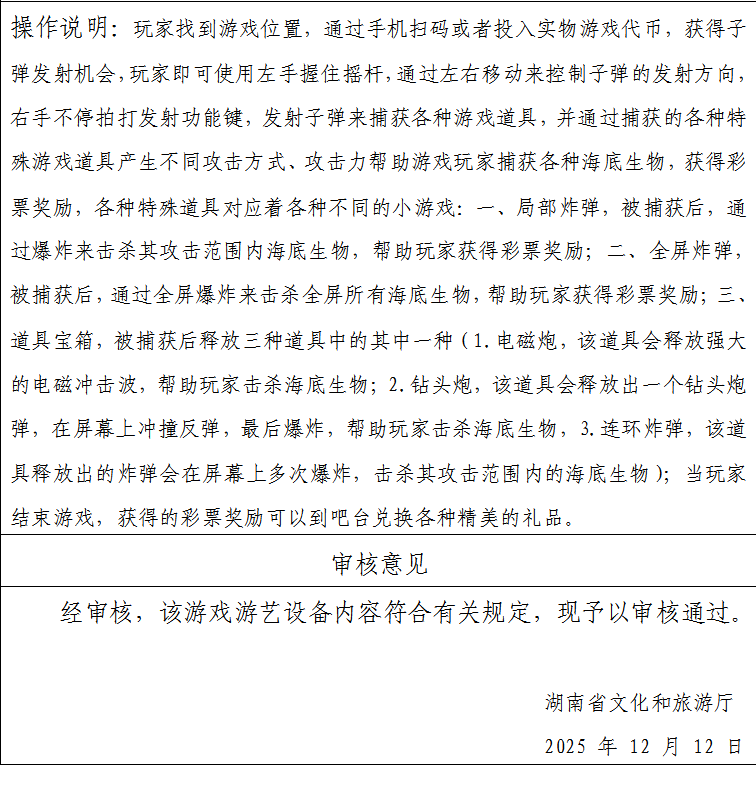 游戏游艺设备内容核准单-批准文号:湘游艺审〔2025〕151号