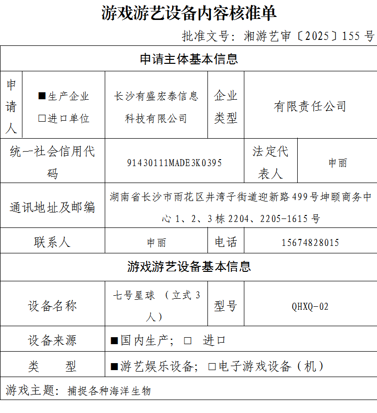 游戏游艺设备内容核准单-批准文号:湘游艺审〔2025〕155号