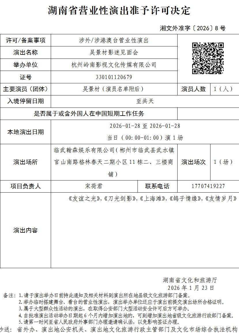 湖南省营业性演出准予许可决定-湘文外准字〔2026〕8号