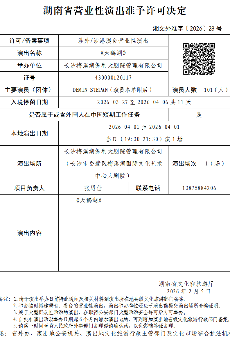 湖南省营业性演出准予许可决定-湘文外准字〔2026〕28号