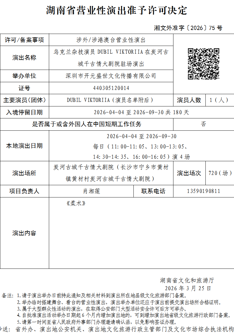 湖南省营业性演出准予许可决定-湘文外准字〔2026〕75号
