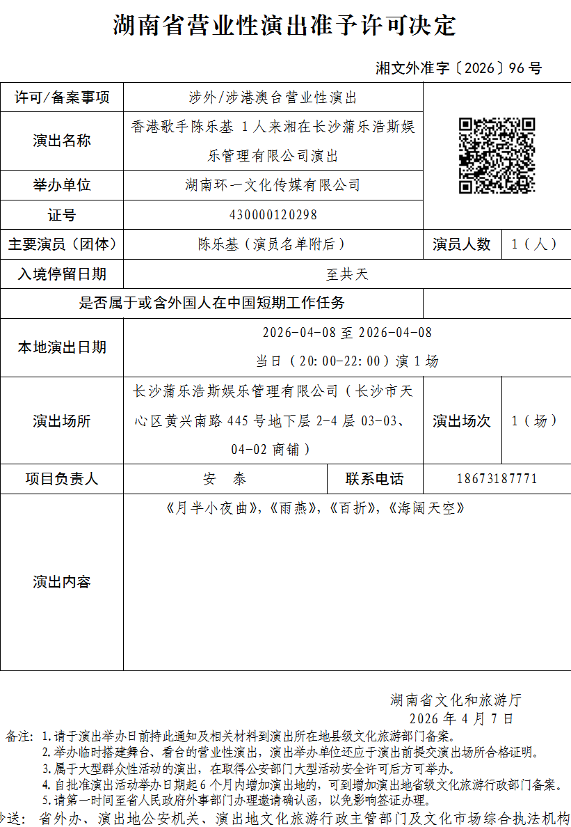 湖南省营业性演出准予许可决定-湘文外准字〔2026〕96号