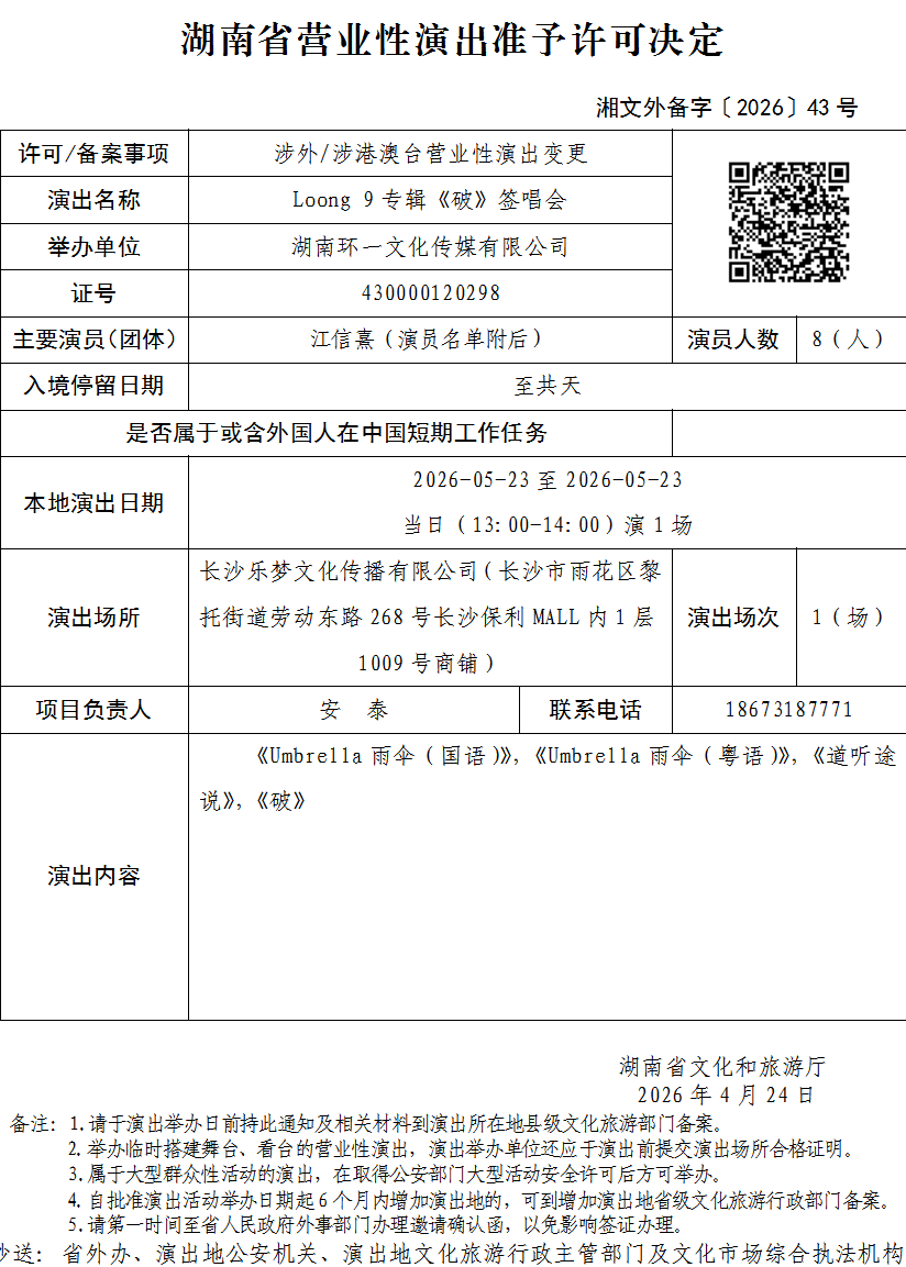 湖南省营业性演出准予许可决定-湘文外备字〔2026〕43号