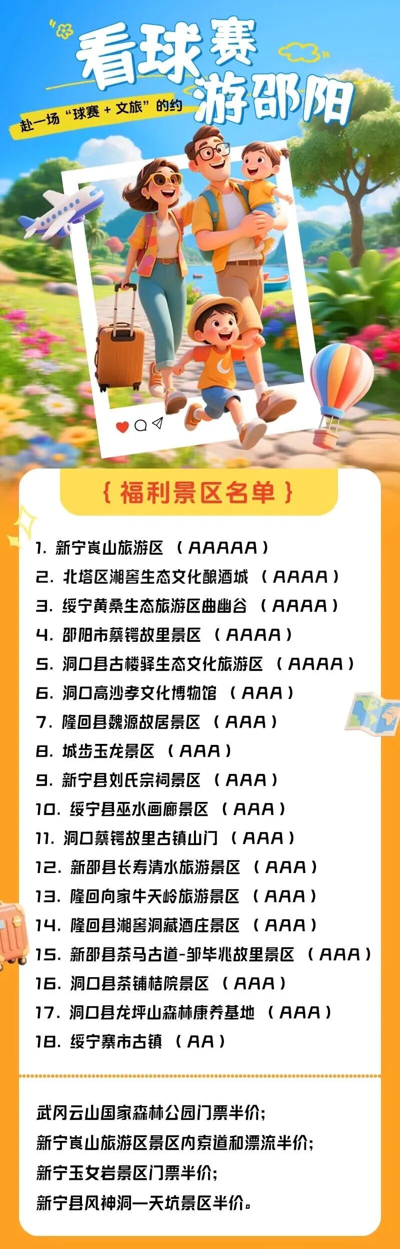 当湘超的哨声吹响,当邵阳的山水张开怀抱,这场文体旅的狂欢怎能少了你?带上家人、约上球友,抢购 “门票 + 住宿” 自驾游套票,凭票免费逛遍 18 个景区,在绿茵场见证热血,在古城山水间邂逅美好,让每一段旅程都充满惊喜与感动!